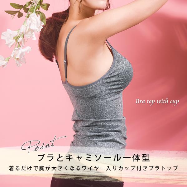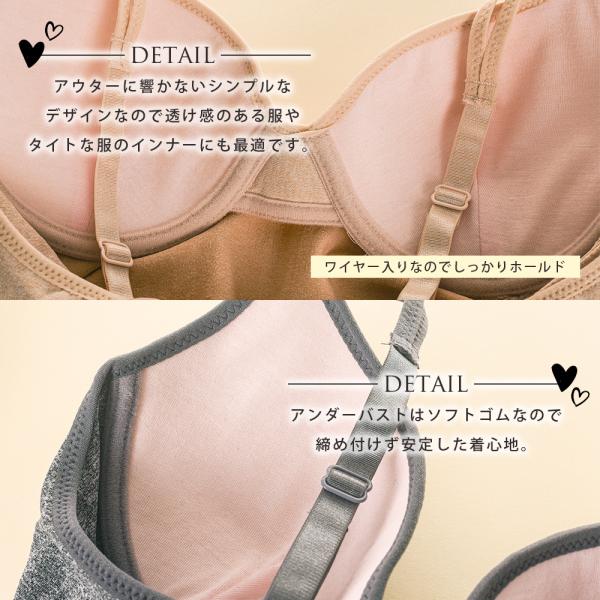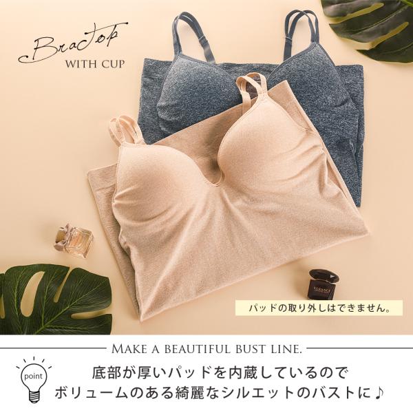 着るだけで胸が大きくなるワイヤー入りカップ付きブラトップ。ブラとキャミソール一体型で「ストレスフリー」と「きちんと胸」を両立する高機能インナーです。底部が厚いパッドを内蔵しているのでボリュームのある綺麗なシルエットのバストに♪デコルテラインを綺麗に見せる深いVネックライン。アンダーに響かないシンプルなデザインなので透け感のある服のやタイトな服のインナーにも最適です。アンダーバストはソフトゴムなので、締め付けず安定した着心地。ストレッチ性のあるなめらかな素材で程よくフィットします。丈夫な吸水速乾素材でオールシーズン大活躍。