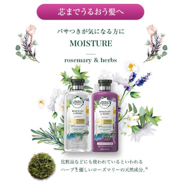 保湿効果たっぷりで髪に潤いを与え、優しくダメージ補修。従来品比90%が自然由来の成分で出来ているシャンプーです。天然由来の成分を、高純度化した水に少ない工程で配合しました。ローズマリー配合処方。髪の水分バランスを整え、芯までうるおう髪へ。