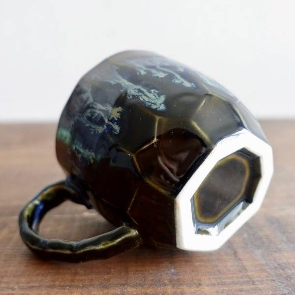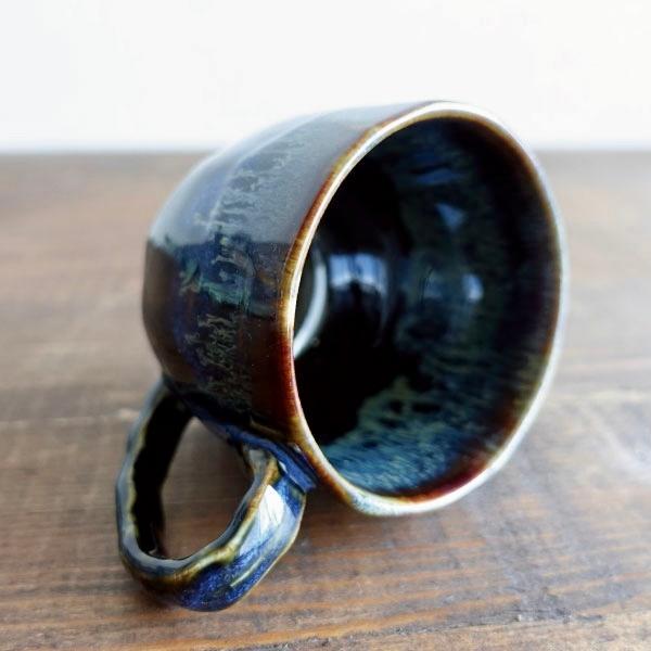 黒と青をベースに窯変によって複雑な色相で彩られた個性的な模様が特徴的なマグカップです。