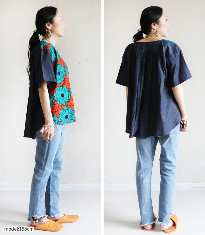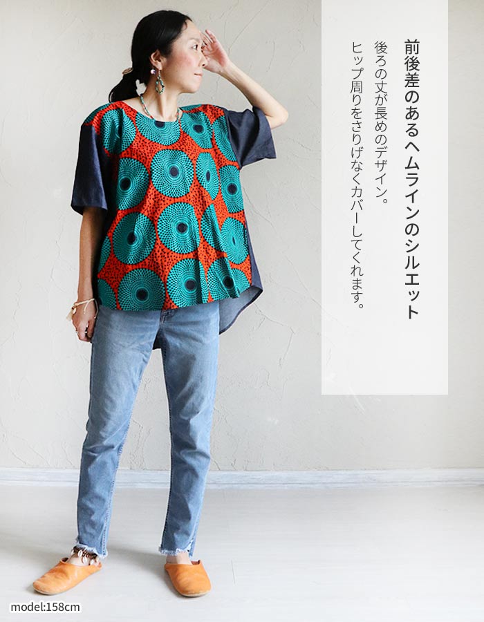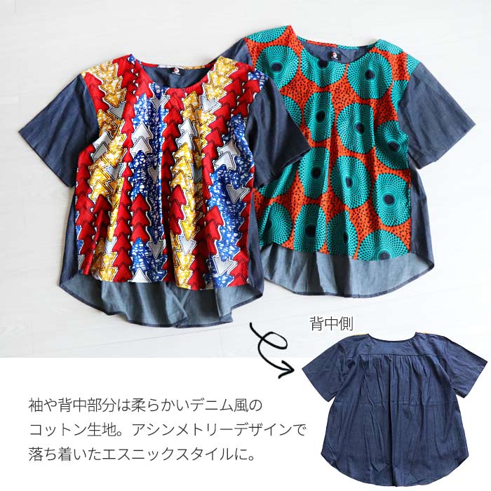 トップス カットソー エスニック トップス カンガ デニム アフリカン アフリカ 半袖 ファッション レディース カジュアル フィッシュテール 後ろ長い(2)