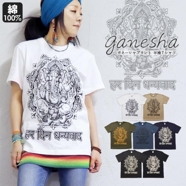 Tシャツ エスニック 半袖 ガネーシャ 神様 ヒンディー ロータス カットソー トップス 白T ファッション アジアン メンズ レディース 男女兼用(1.5)