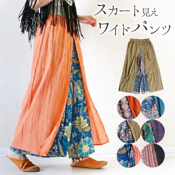 スカートパンツ パンツスカート ロングスカート パンツ エスニック ボトムス レディース ファッション ドッキング バイカラー レーヨン100% カジュアル