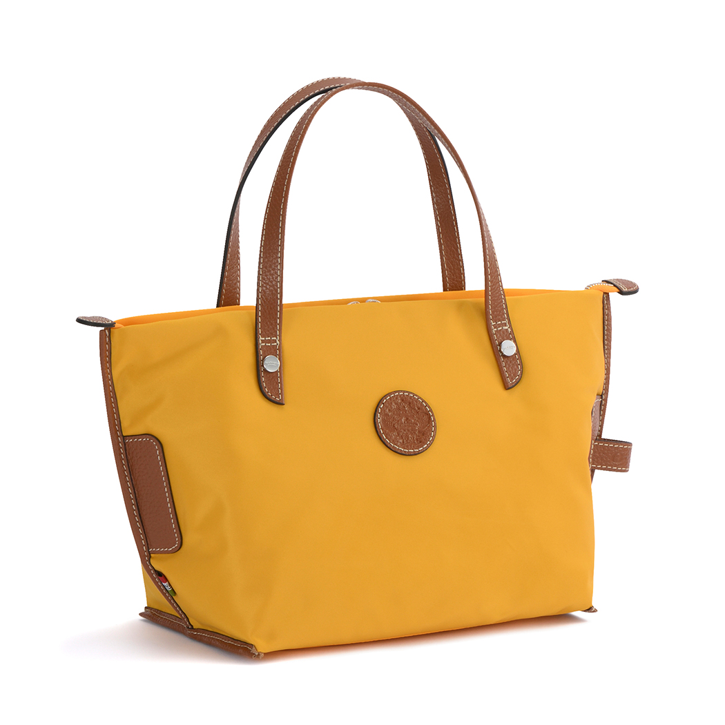カラフルなナイロンツイルと、持ち手のブラウン(牛革)がアクセントになったシンプルなトートバッグ。
