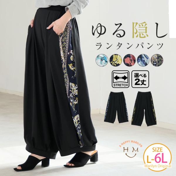 大きいサイズ レディース パンツ 2丈から選べる サイドスリット 上品柄 ランタンパンツ ボトムス 派手パンツ イージーパンツ 柄物 LL 3L 4L 5L 6L A