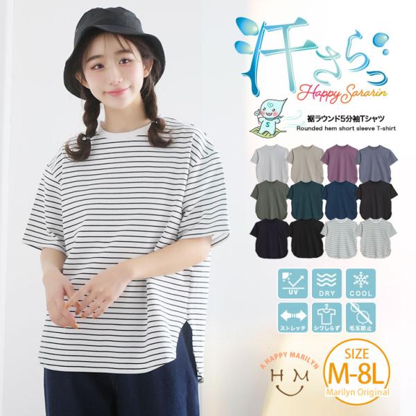 大きいサイズ レディース トップス ハッピーさらりん 裾ラウンド 五分袖 Tシャツ カットソー プルオーバー LL 3L 4L 5L 6L 7L 8L 夏 夏物 A