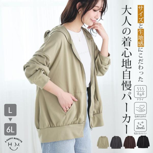 大きいサイズ レディース パーカー さらっとドライタッチ 着心地にこだわった フロントジップパーカー トップス ライトアウター LL 3L 4L 5L 6L 長袖 A