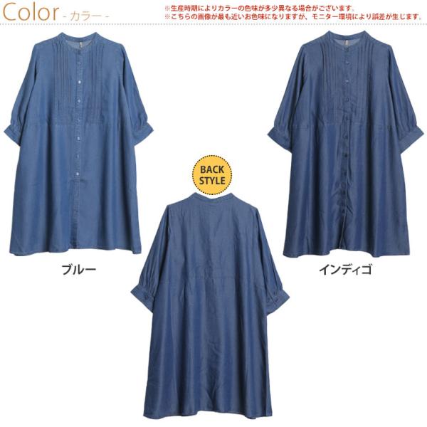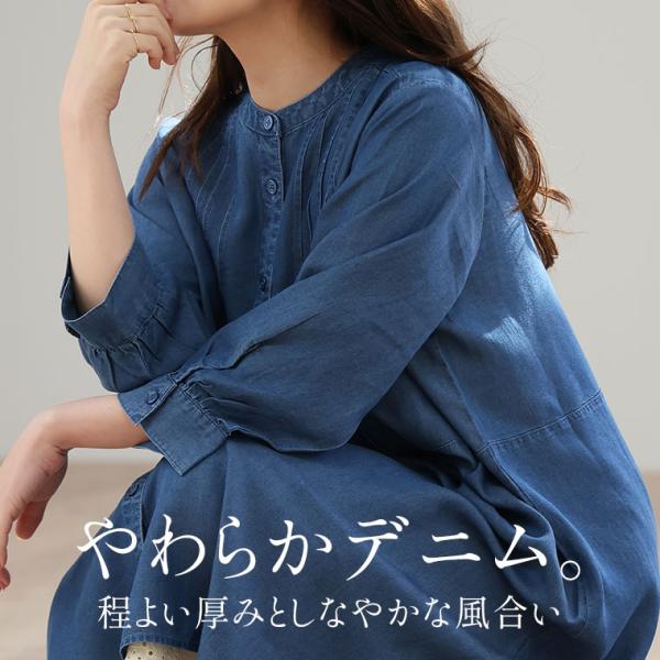 大きいサイズ レディース チュニック 軽くて柔らか バンドカラー ピンタック デニム シャツ チュニック ブラウス トップス LL 3L 4L 5L 6L 七分袖