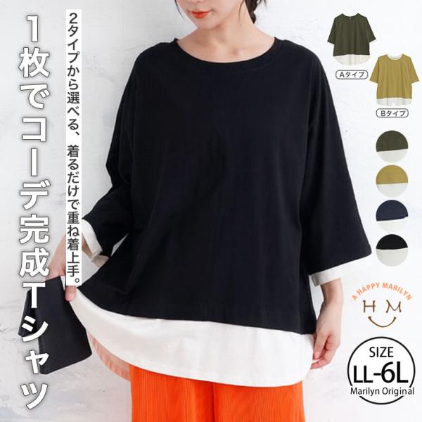 大きいサイズ レディース トップス 綿100% 残暑はオシャレ&涼しく決める 2typeから選べる レイヤード風 カットソー 七分袖 Tシャツ LL 3L 4L A