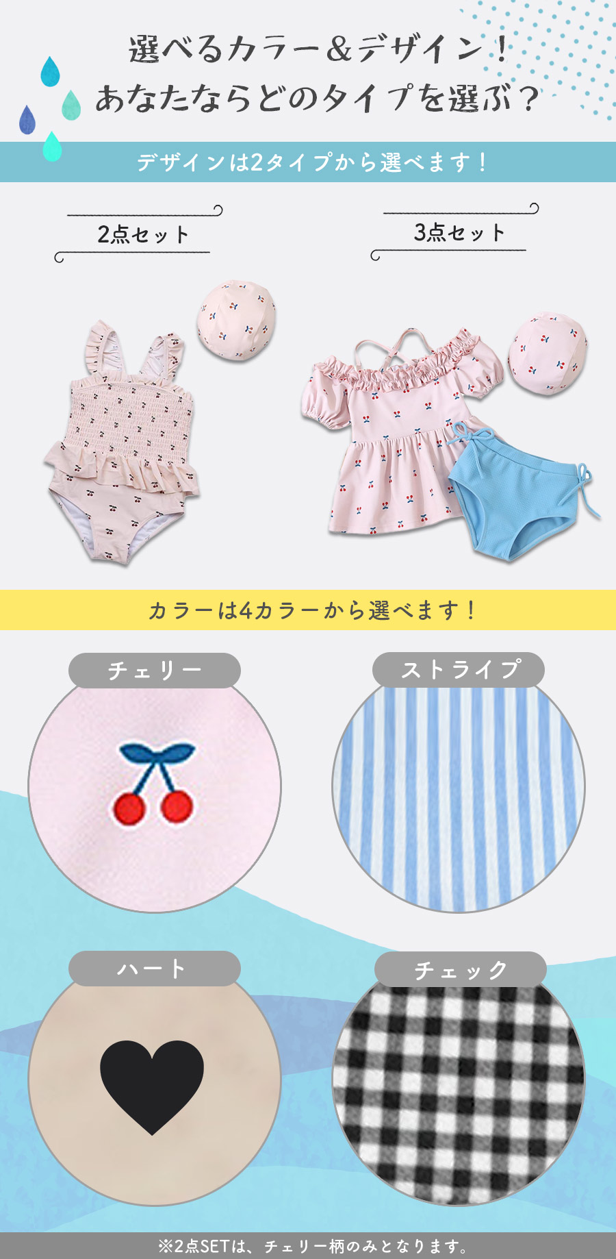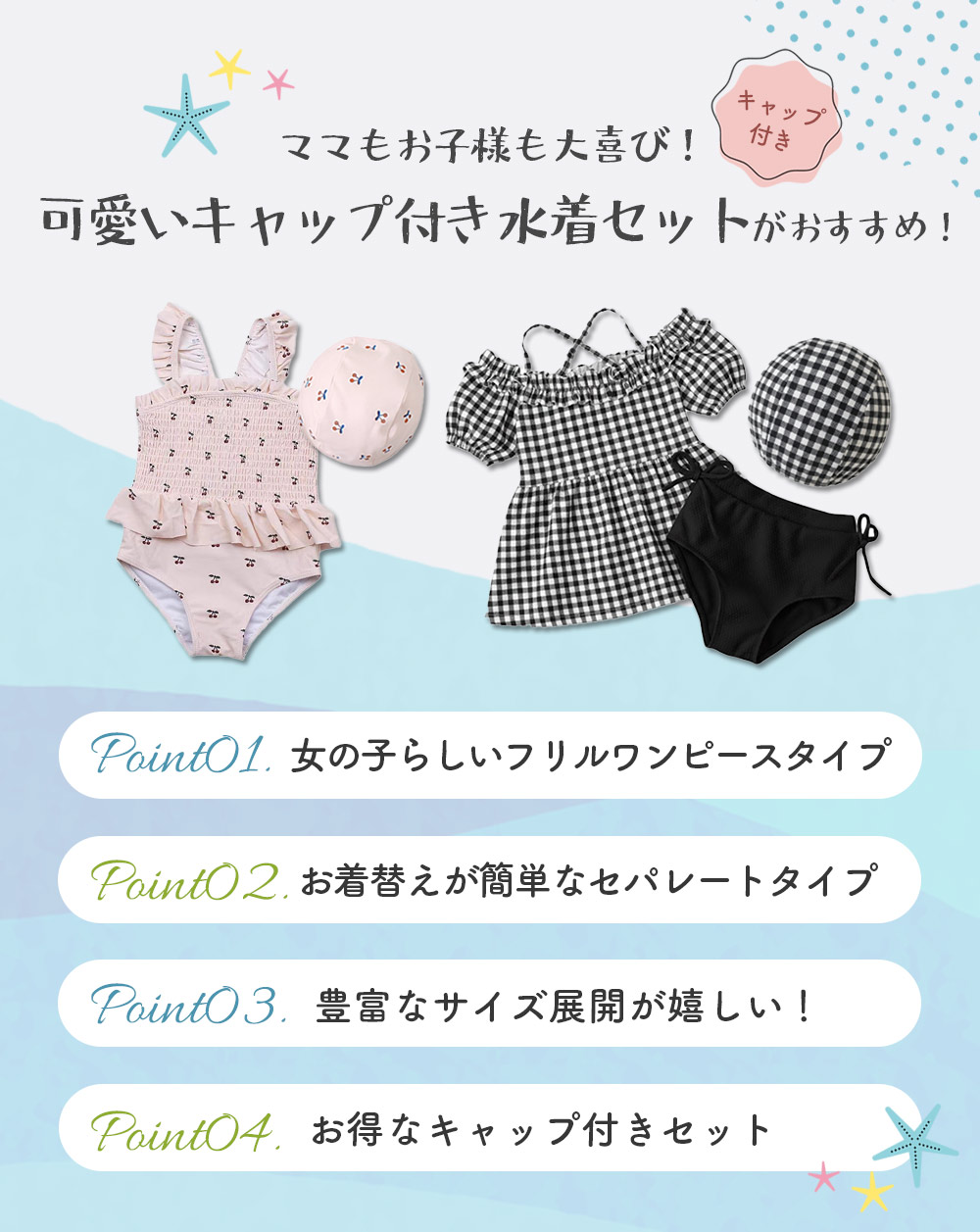 キッズ水着 女の子 ワンピース キャップ付き かわいい おしゃれ 水遊び プール 水泳帽 スイムウェア 2点セット 3点セット 子供水着