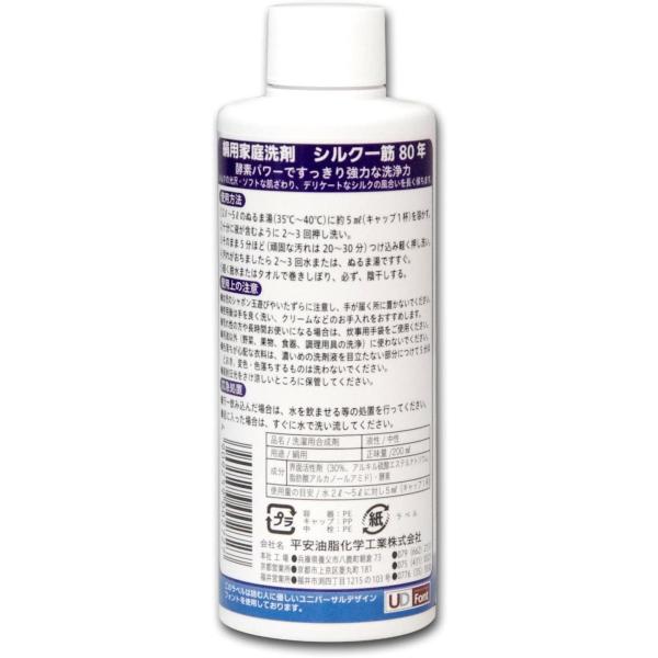 シルクの生地を傷めない絹専用洗剤です。シルクのための「シルクパウダー」入りです。クリーニングには出したくないが洗濯機で洗ってしまうと絹の風合いを失ってしまう。そこで絹の風合いをそこなわず洗浄力の高い、しかもご家庭で簡単に洗濯できる洗剤「シルクランドリー」の登場です。【使用方法】(1)2Lのぬるま湯(35〜40℃)に約5ml(内キャップ一杯)を溶かします。(2)充分に液を含むように、2〜3回押し洗います。(3)そのまま20〜30分浸け込み、再度2〜3回軽く押し洗いします。(4)汚れが落ちたら、2〜3回水またはぬるま湯ですすぎます。(5)軽く脱水、またはタオルで巻きしぼりして、必ず陰干しをします。