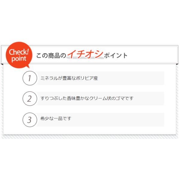 すりつぶした香味豊か絹こし胡麻は、適度に焙煎し、すりつぶした香味豊かなクリーム状のゴマです。黒ゴマは、ミネラルが豊富なボリビア産の二枚皮(ダブルハスク)を使用。こちらも他社があまり使用していない希少な一品です。