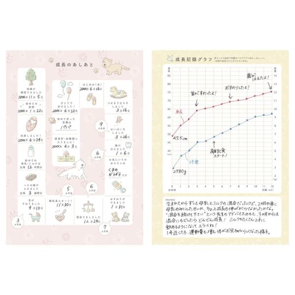 1年の成長がひと目でわかる「成長記録グラフ」や、ハイハイや立っちなどの“はじめて記念日”を記録できる「成長のあしあと」など、赤ちゃんとの思い出を楽しく記録できるコンテンツページも充実。