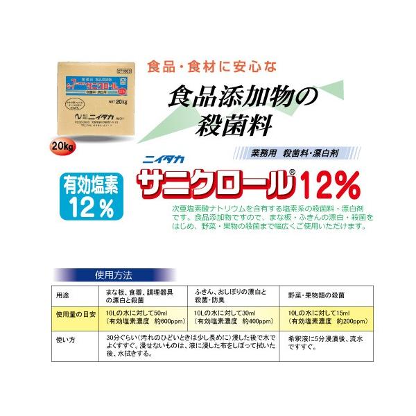 【ニイタカ】サニクロール12% 20Kg(BIB) 業務用漂白剤/殺菌/漂白/食品添加物/次亜塩素酸ナトリウム/漂白剤/ブリーチ