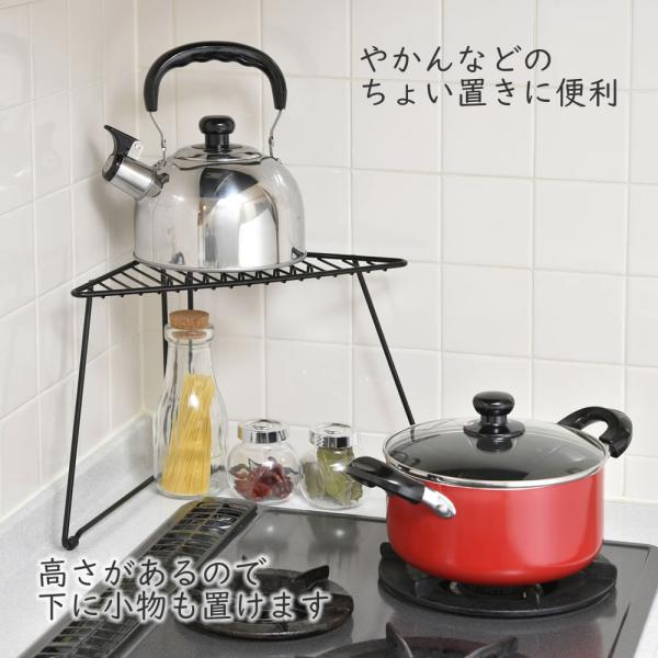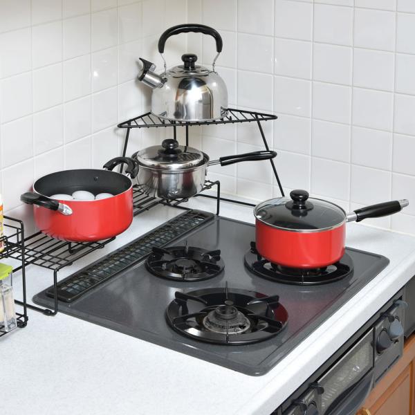 コンロ角ラック ◆ キッチン コンロ奥 空きスペース活用 2段置き コンロまわり収納 鍋置き IH デッドスペース活用 調味料置き キッチンラック コンロサイドラック ちょい置き 隅 やかん ケトル フライパン 一時置き シンプル 調理スペース