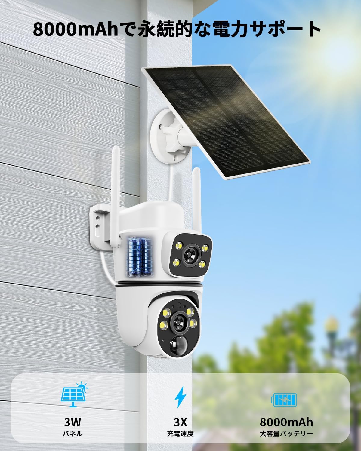 防犯カメラ 屋外 家庭用 ソーラーカメラ wifi ワイヤレス デュアルレンズ 防犯カメラ パンチルト機能 監視カメラ 屋外 無線カメラ ソーラー フルカラー