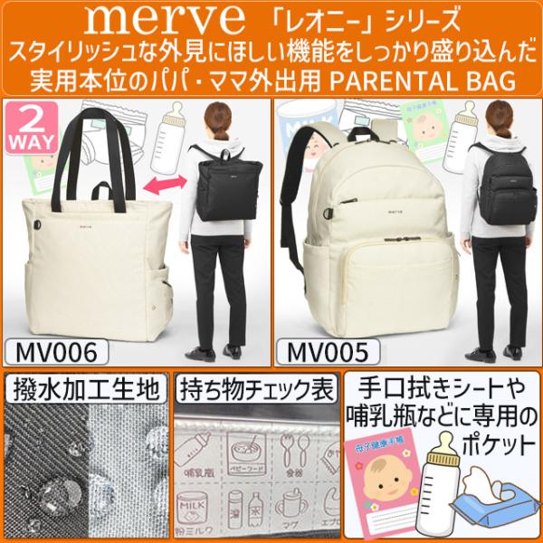 レディース 子育てバッグ マザーズバッグ 2WAY トートバッグ リュックサック パパ・ママバッグ 育児バッグ メルヴェ レオニー 撥水 merve MV006