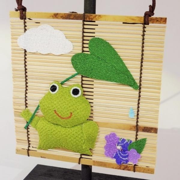 ちいさなすだれに、ちりめんで作られたかえると紫陽花をあしらった梅雨の飾りです