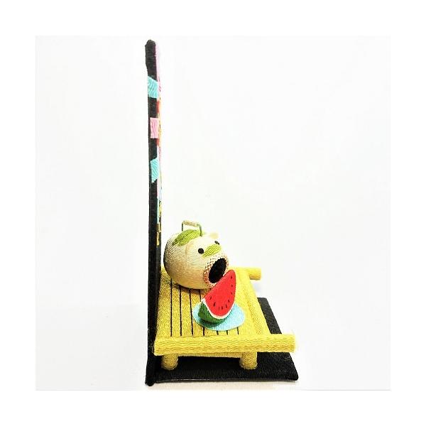 ちりめんで作られた縁側に置かれたスイカと蚊遣り器、