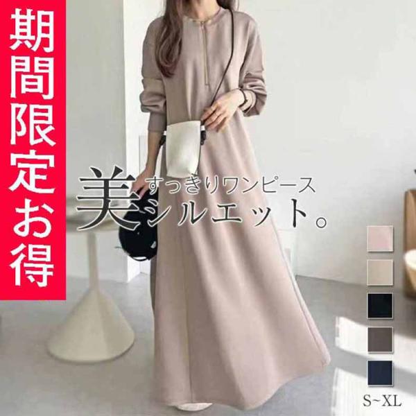 ハーフジップワンピース マキシワンピース レディース ロングワンピ 長袖 体型カバー 高見え 低身長 高身長 秋 大人カジュアル シンプル 楽ちん 着回し