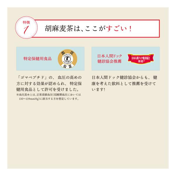 血圧が高めの方におすすめの特定保健用食品です。 『胡麻麦茶』は、胡麻から生まれたゴマペプチドを含み、血圧が高めの方への試験では4週間後に低下が見られたことを確認しております。 この研究データにより、特定保健用食品の許可を取得いたしました。