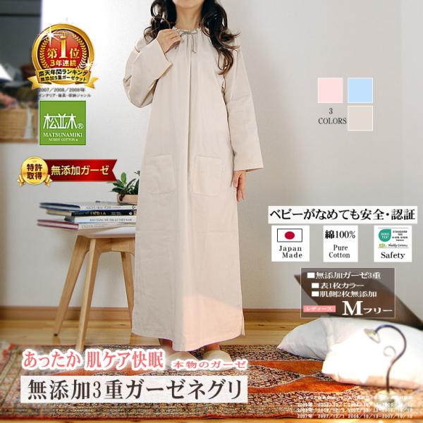 ネグリジェ 長袖 スモッグ レディース 安心安全 無添加ヌーディコットン3重ガーゼ 吸水速乾 綿100% 日本製 松並木 エコテックス認証 敏感肌 カラー あったか