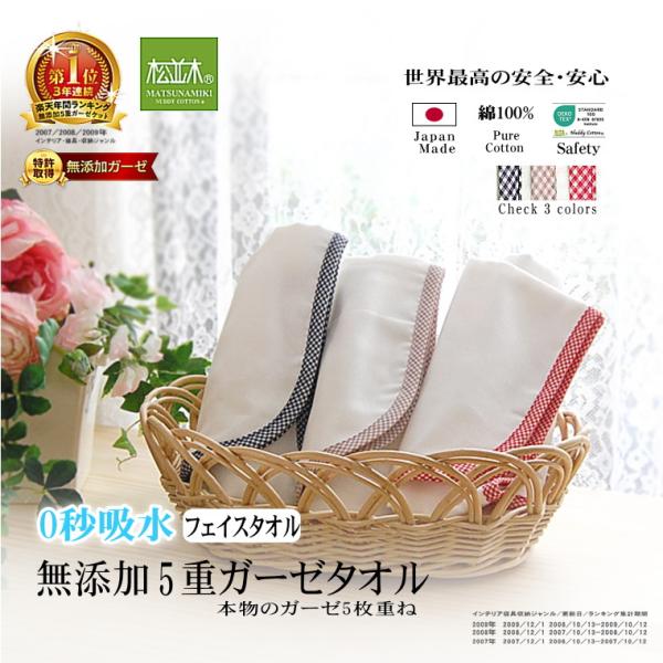 ガーゼ タオル フェイスタオル 約35×85cm チェック縁取り 3色 無添加 ガーゼ 吸水速乾 綿100% 日本製 松並木 エコテックス認証 敏感肌 アトピー 5重