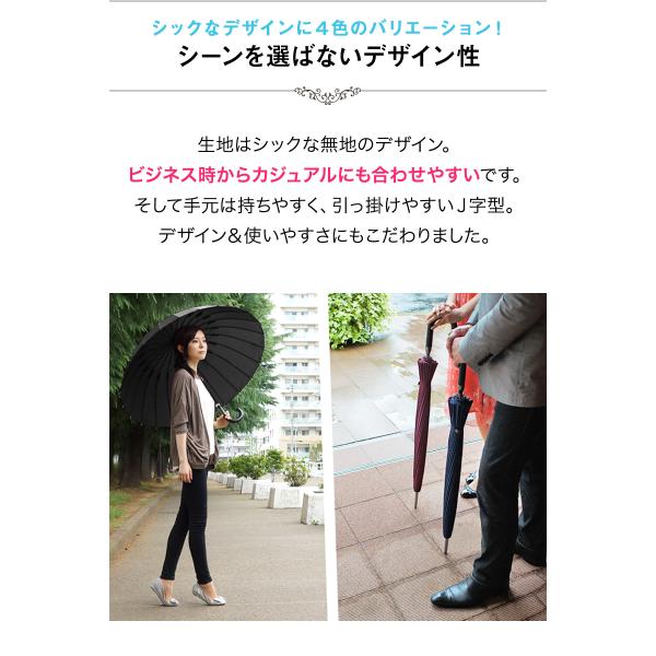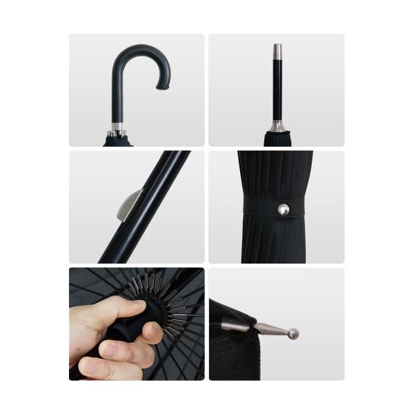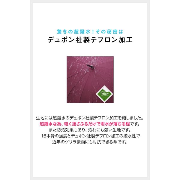 24本骨の強度とデュポン社製テフロン加工の撥水性で近年のゲリラ豪雨にも対抗できる傘です。
