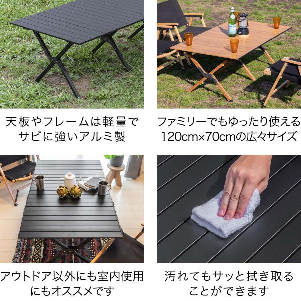シックなマットブラックの幅120cmのテーブル。材質は、軽くてサビに強いアルミを採用。ロール式天板、組立て式フレームで小さく収納可能。幅も120cmある為、ファミリーでも広々使えます。