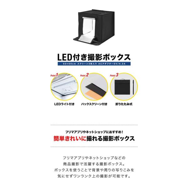 撮影ボックス 撮影キット 撮影ブース 50x50cm LEDライト付き 背景布 スクリーン 3枚付き 折りたたみ 写真 撮影 スタジオ ブース ボックス ミ 1年保証 送料無料