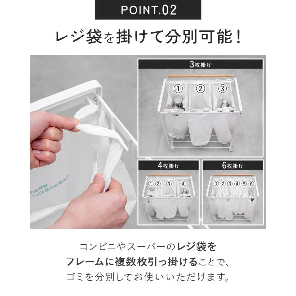 コンビニやスーパーのレジ袋をフレームに複数枚引っ掛けることで、ゴミを分別してお使いいただけます。