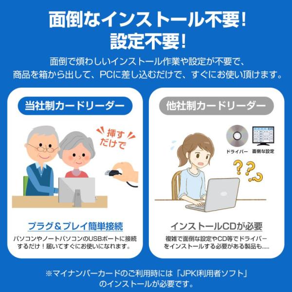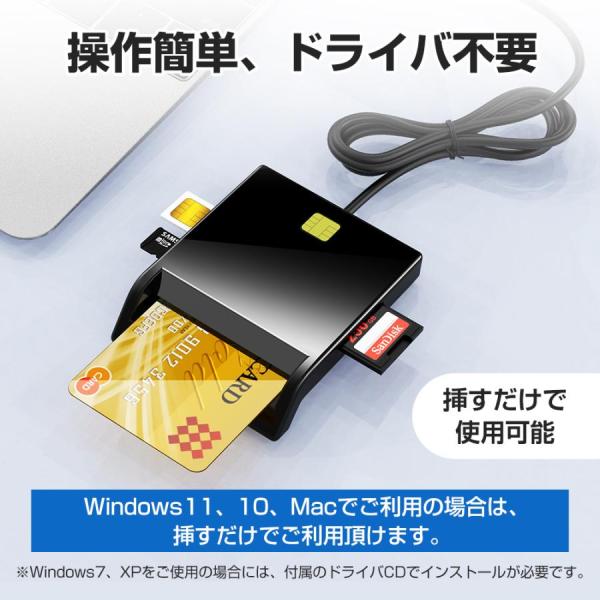 マイナンバーカード、住民基本台帳カード、ICチップ付きクレジットカード、銀行キャッシュカードなど、さまざまなICカードの読み取りに対応しています。