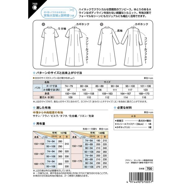 型紙 パターン ハイネック ロングワンピース 7005 フィットパターンサン サンプランニング 大人 子供 ベビー 赤ちゃん 作り方 洋裁
