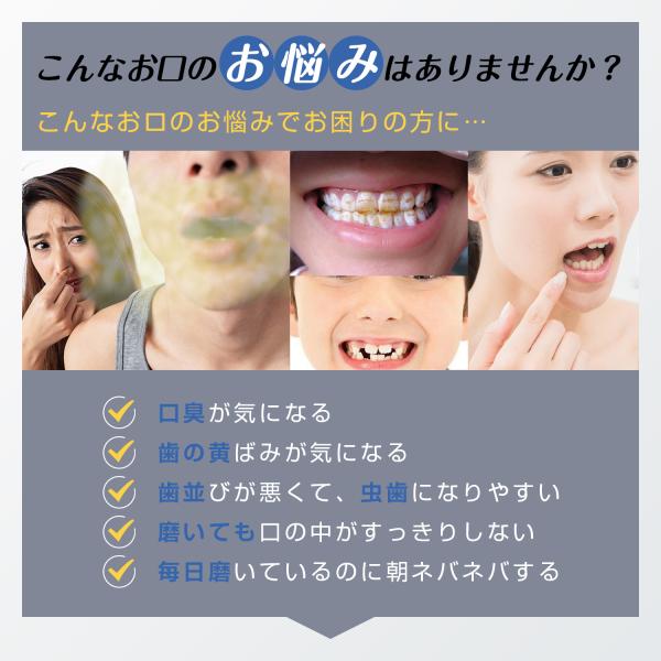 約42,000回/分の高速音波振動と幅広い振幅でしっかり歯垢を落とし、同時に起こる音波水流で歯間の奥と歯と歯ぐきの汚れをやさしく効果的に除去する。磨きより100倍の歯垢を除去できます。2週間をかかるだけ、健康的な口内環境をもらいます。