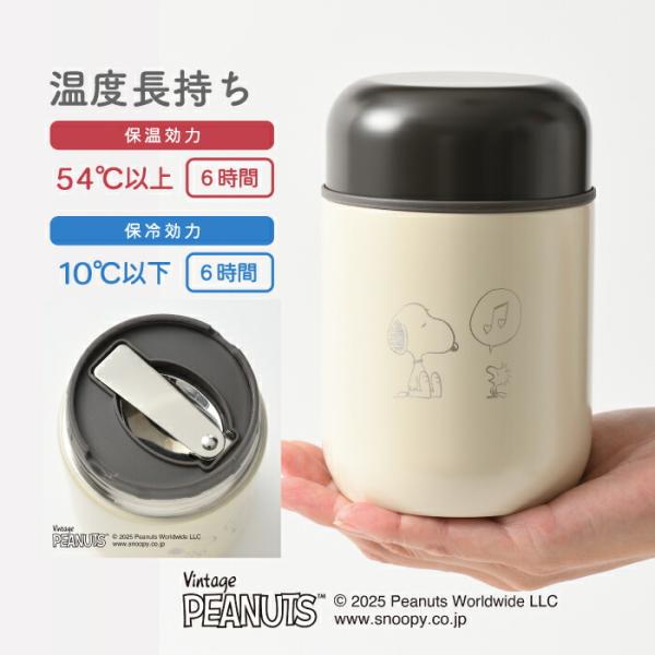 「幸せ」をテーマにしたスヌーピーたちのイラストがポイントのスープジャー。出来立てのおいしさを閉じ込める真空二重構造で、オフィスでのランチはもちろん、アウトドアにも大活躍。フタの内側には折りたたみスプーンが収納されているので、かさばることなくスマートに持ち歩きができます。パーツはすべて分解可能で洗いやすく、お手入れも楽々です。