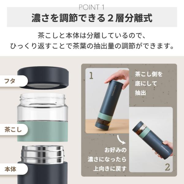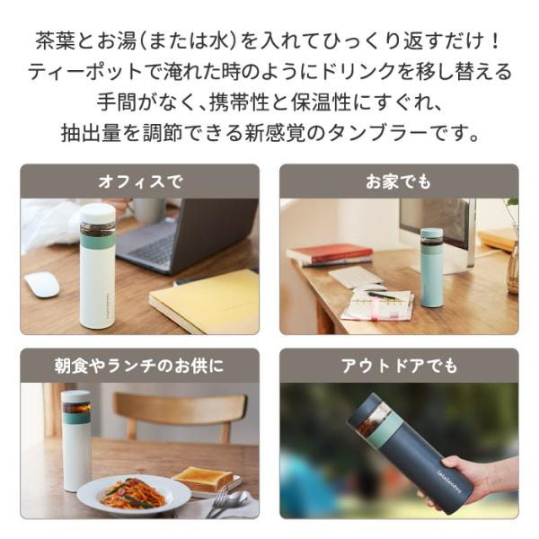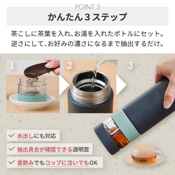 茶葉を入れ、お湯(又は水)を注ぐ→茶こしを装着→ひっくり返して好みの濃さに!