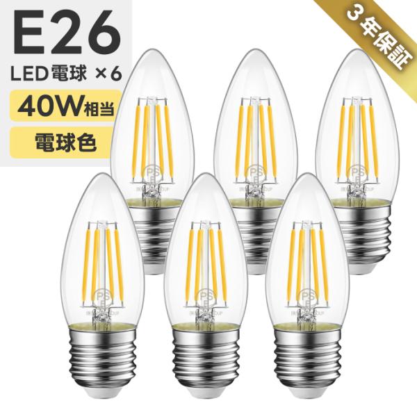 LEDシャンデリア電球 6個セット E26口金 電球色 40W形相当 燭台電球 フィラメント 広配光 4.5W レトロ LED 長寿命 節電 小形電球 非調光 玄関 廊下 トイレ 店舗