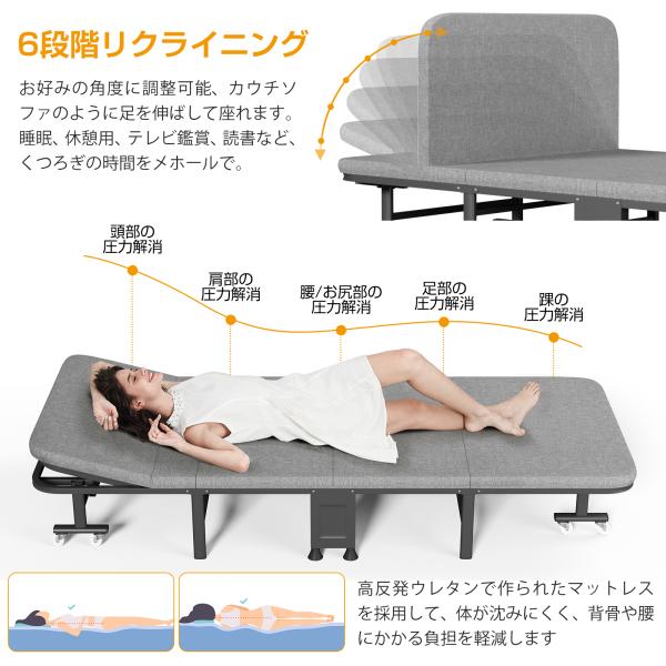 折りたたみベッド シングル コンパクト収納 6段階リクライニング 高反発 マットレス付 四つ折り 簡易ベッド 幅80cm 耐荷重200kg おしゃれ キャスター付 収納袋付