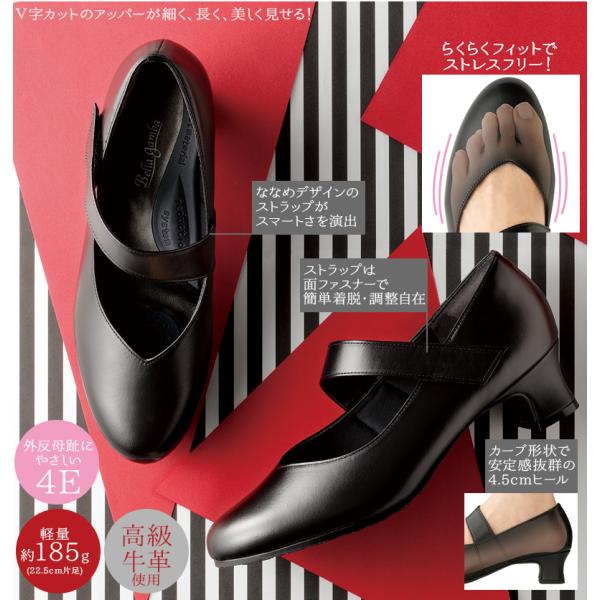 ・シューフィッタープロデュース、4Eなのに足をキレイに見せる、Vカット・ななめストラップのデザイン。