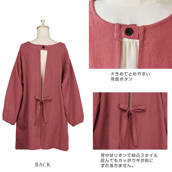 背中はリボンで結ぶスタイルで、かがんでも前にかっぽう着がズレ落ちてきません。