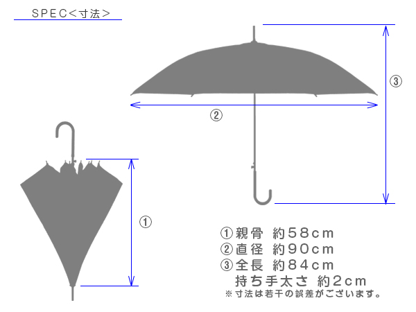 表記サイズ / 親骨 約58cm 傘を開いた時の直径約90cm 柄の全長約84cm