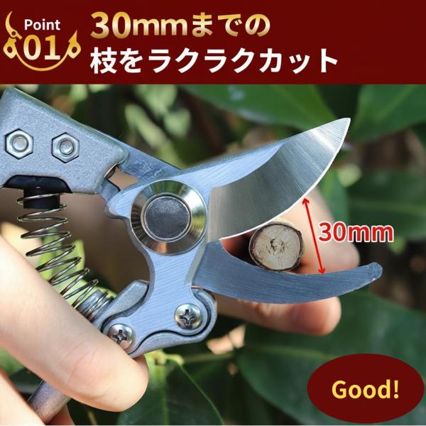 ◆ 刃には耐久性に優れたSK-5スチールブレードを採用。最大30mmの太い枝までしっかり切断可能。 家庭菜園 や 植木 のメンテナンスにも活躍します。