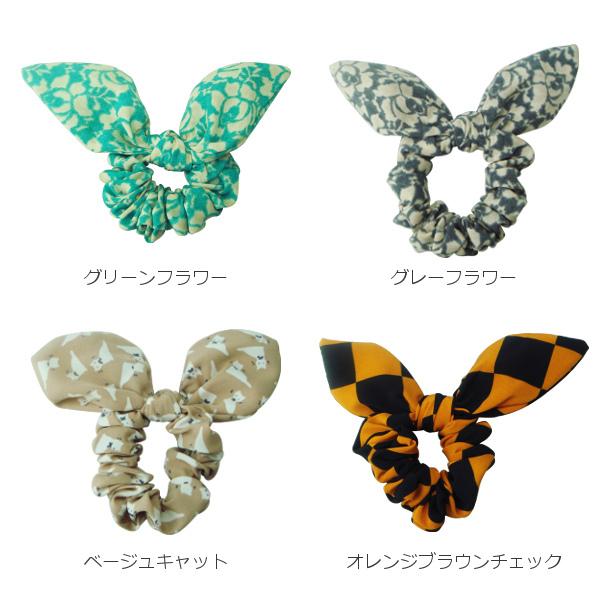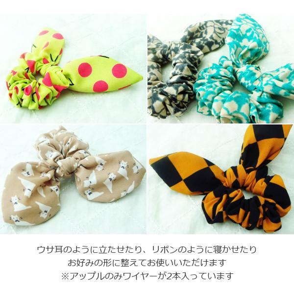 シュシュ 大人プリントのウサ耳リボンシュシュ ヘアアクセサリー りぼん うさ耳 チェック ドット りんご 猫 ブルー 青 グリーン 緑 ベージュ 茶色 ブラウン