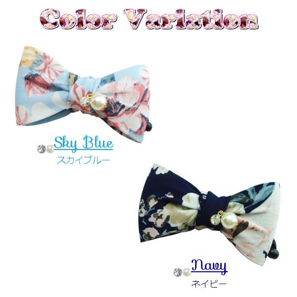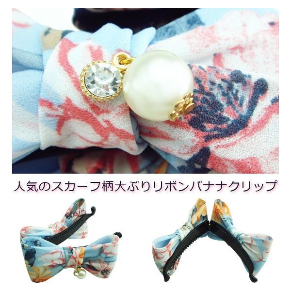 ヘアクリップ バナナクリップ パールモチーフ付きスカーフ柄リボンバナナクリップ ブルー 青 水色 ネイビー 紺色 りぼん 花 フラワー
