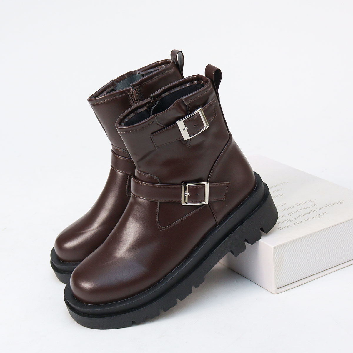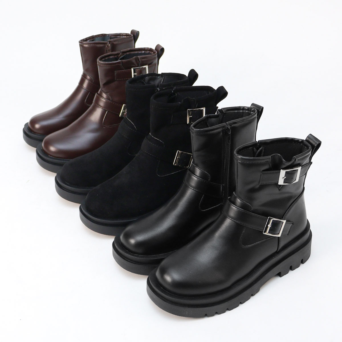ブーツ エンジニアブーツ ショートブーツ ショート丈 ラウンドトゥ ベルト サイドジップ ファスナー 厚底 ボリュームソール トラックソール タンクソール 防滑 美脚 スタイルアップ 滑りにくい 歩きやすい カジュアル シンプル かっこいい かわいい おしゃれ コスプレ 合成皮革 合皮 PUレザー スエード スウェード 靴 シューズ 男女兼用 ユニセックス おそろい お揃いコーデ ペアルック 親子コーデ 小さいサイズ 大きいサイズ レディース メンズ 黒 ブラック 茶 ダークブラウン 5cmヒール LiBERTYDOLL リバティードール SS 22cm 22.5cm S 23cm M 23.5cm L 24cm LL 24.5cm 25cm 25.5cm 26cm 26.5cm 27cm 10代 20代 30代 40代 50代