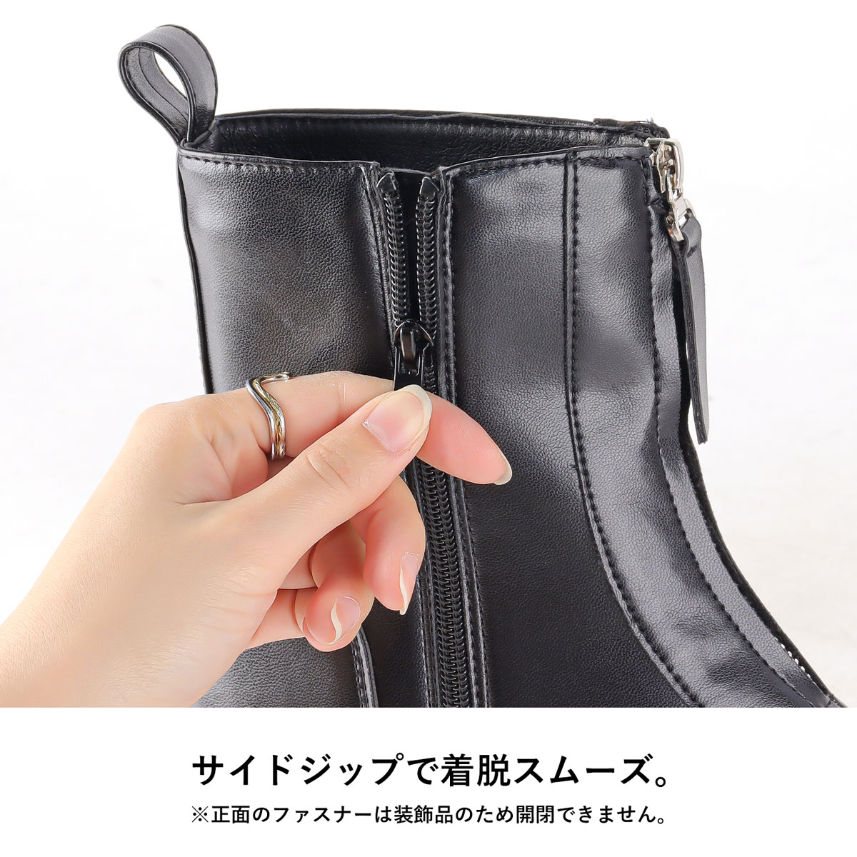 内側のサイドファスナーで、脱ぎ履きをスムーズに行えます。