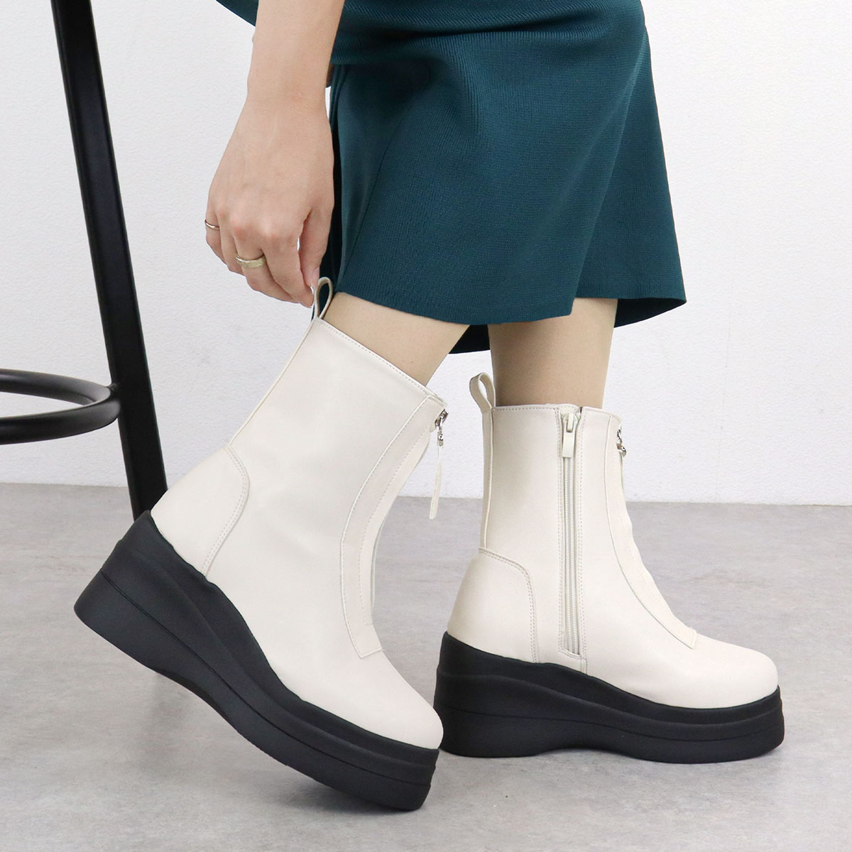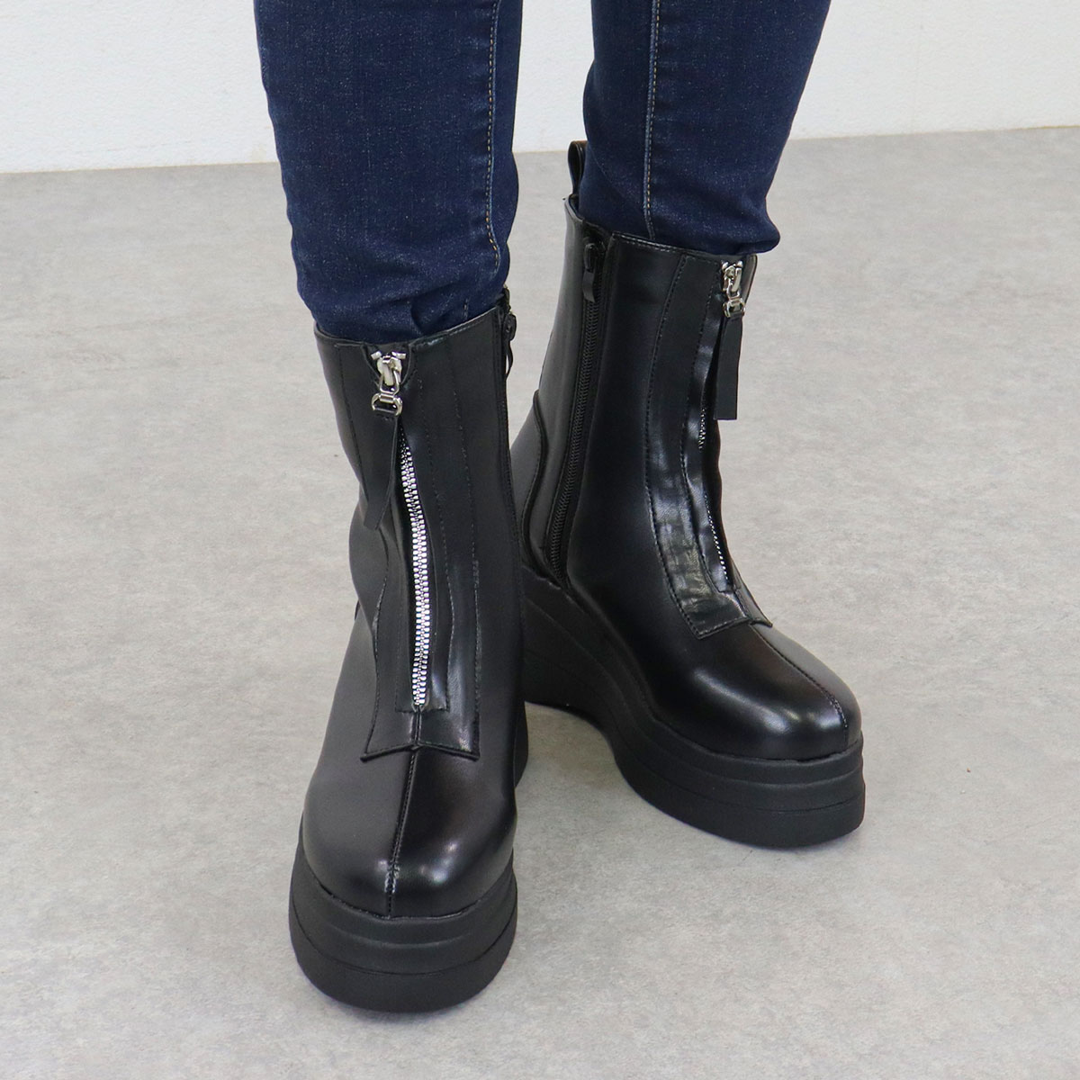 フロント部分のジップデザインがポイントの厚底ショートブーツ。