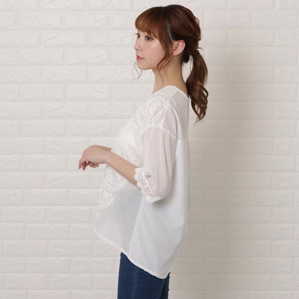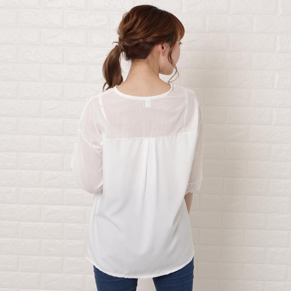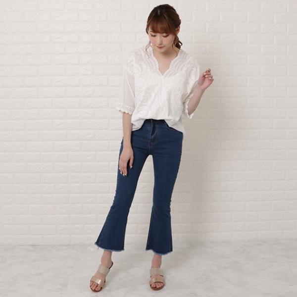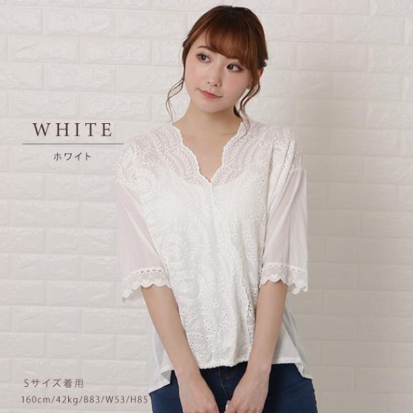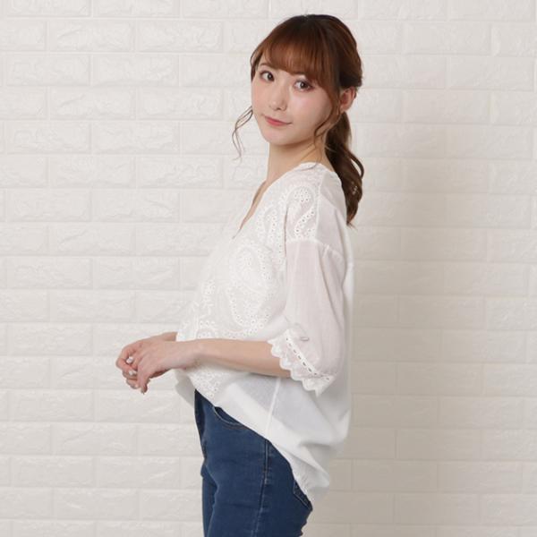 スカラップレース 刺繍 Vネック ブラウス トップス レディース 五分袖 半袖 ドロップショルダー カシュクール パンチングレース 春 夏