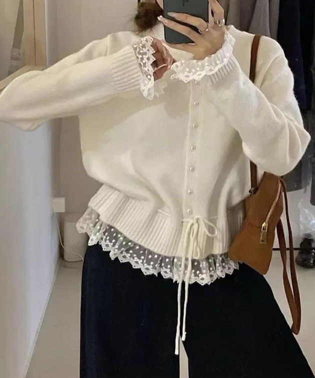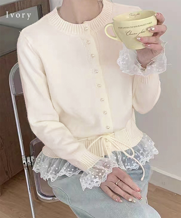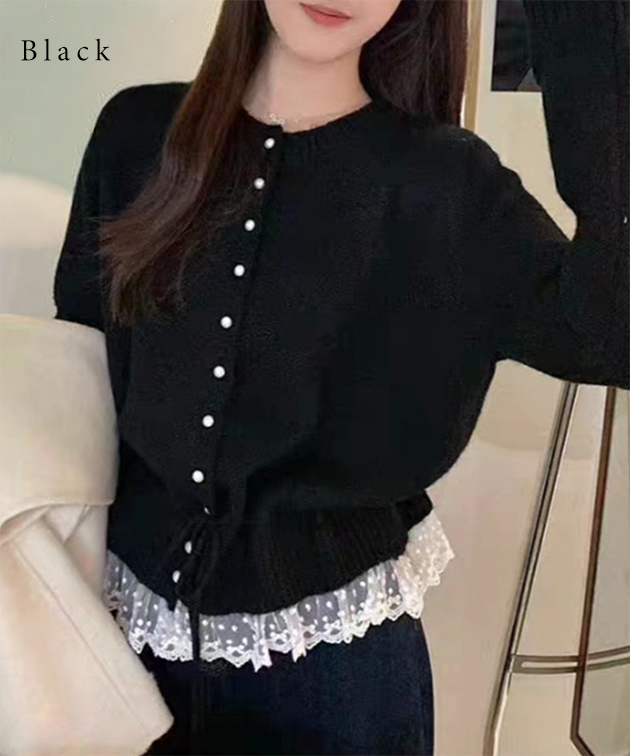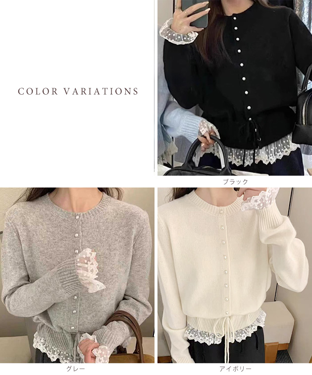 パール ボタン 配レース ニット カーディガン 女性 レディース トップス 秋 冬 セーター 単色 無地 シンプル フリル 透け感 シアー
