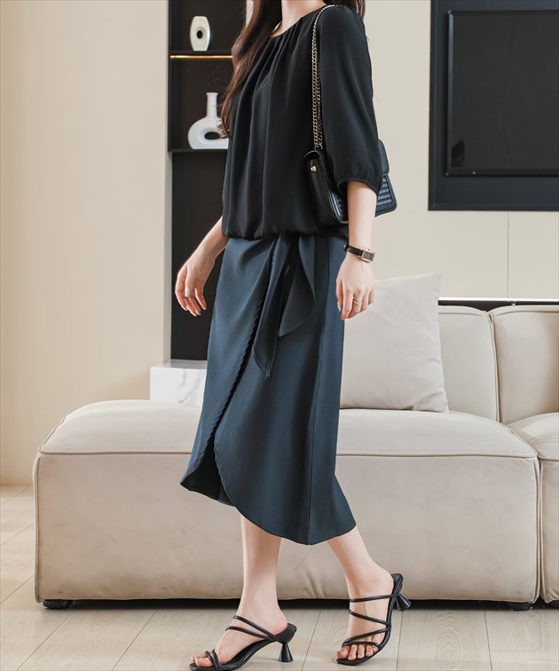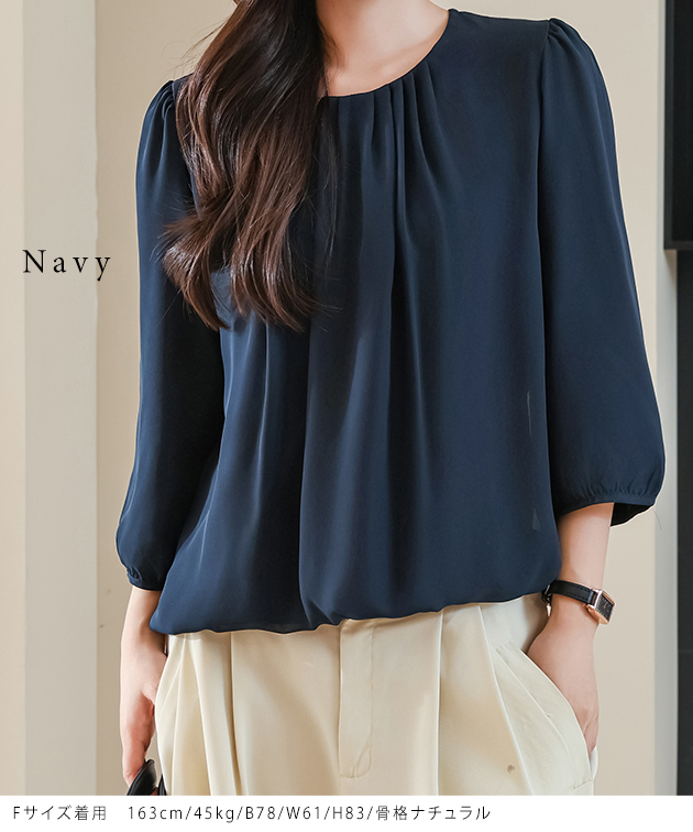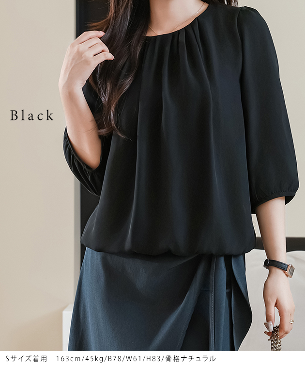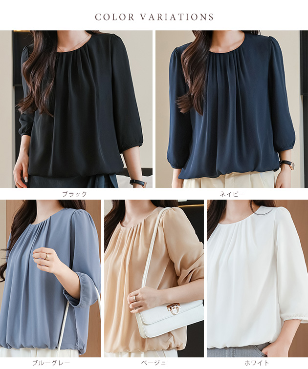 ソリッドカラー ラウンドネック 7分袖 バルーン プルオーバー 女性 レディース トップス ブラウス 春 夏 秋 単色 無地 タック ギャザ