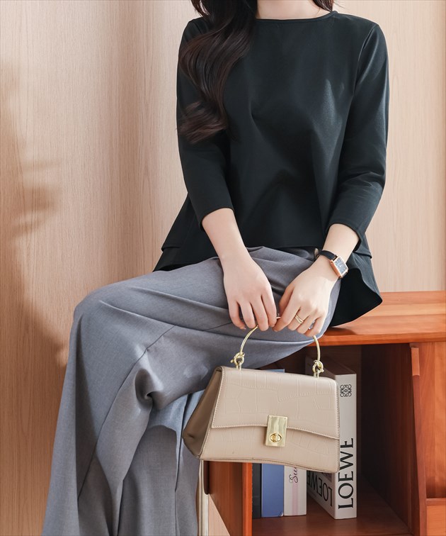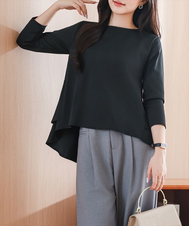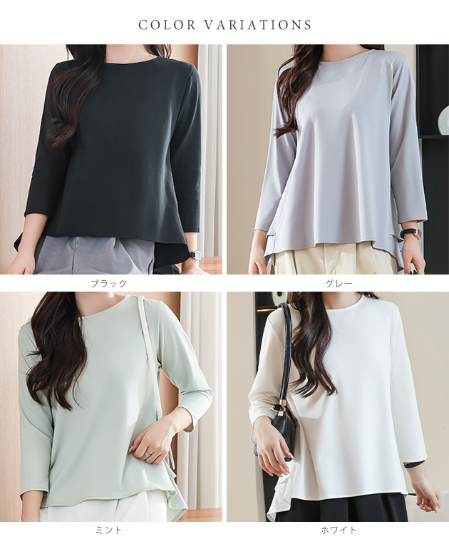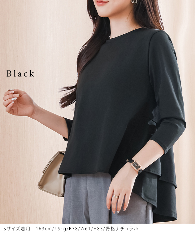 ソリッドカラー ティアードフリル 7分袖 フレア プルオーバー 女性 レディース トップス ブラウス 単色 無地 Aライン シンプル エレガ